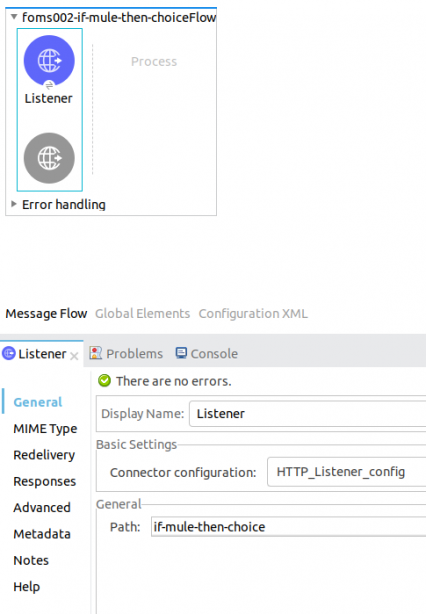 As shown in FoMS App 001, start Anypoint Studio, create a new Mule project and name it foms002-if-mule-then-choice!