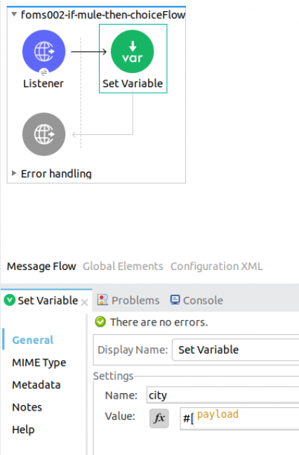 Add Set Variable component in the flow, right after the HTTP Listener and configure it with the following data: